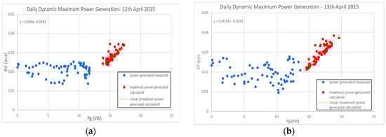 Voltage variation x generated power and the linear dependency in relation to the maximum amount of power calculated by Equation (5) for 12th of April 2015 and 13th of April 2015.