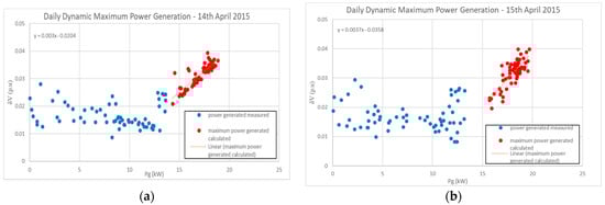 Voltage variation x generated power and the linear dependency in relation to the maximum amount of power calculated by Equation (5) for 14th of April 2015 and 15th of April 2015.
