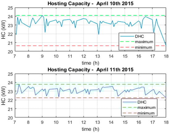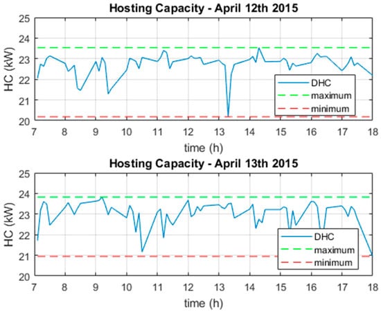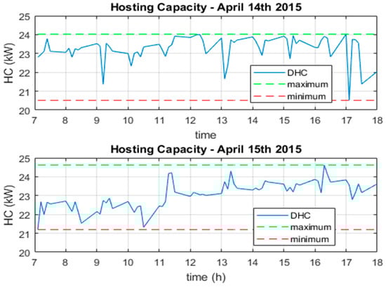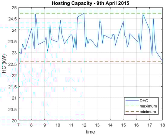 The average score for the 9th of April was 24 kW, as calculated through the daily DHC(t) profile. Remarkably, some values of hosting capacity are slightly higher and lower than the average. These phenomena might have occurred because some external and internal factors had contributed to these differences. In this case, the maximum daily hosting capacity is 24.8 kW, whereas the minimum value is 22.6 kW. In relation to one of the highest value, it is possible to offer an explanation. This result is only significant at a moment when there is almost no solar production because it is early in the morning or there are clouds covering the panels. Thus, the voltage rise will be low due to the lack of solar production, coupled with the fact that the building is empty. For example, one of the highest DHC(t) found was at 12 p.m., which is defined as lunch time and all the building’s equipment are turned off, while of the presence of some clouds in the sky might have decreased the solar production as well. On the other hand, the smaller values observed in the daily DHC(t) could be explained as a result of a huge solar production and no load being fed at that moment. Moreover, the minimum value reached was at 06:00 p.m., which might have happened because most of the electronic equipment of the building was turned on and injecting high levels of distortion at the PCC. Unfortunately, it cannot be ruled out that the factors cited before may have influenced the extreme local hosting capacity values. Further analysis must be conducted.