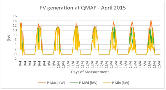 As a conclusion, due to the special characteristic of the building connected to the system, the lower the solar production is, the lower the voltage rise will be. Finally, it can be offered as an explanation regarding the region between the maximum value and the minimum value. As mentioned in the section before, the smaller the acceptable region is, the worse the conditions of the grid will be. In this case, the performance regarding the 9th of April could be related to the fact that the day has presented one of the biggest solar production, as shown in Figure 10. Thus, if the load of the building is lower than expected and the PV production is almost reaching its peak, the range of harmonic distortion, as well as the voltage rise, would impact its DHC(t) profile.