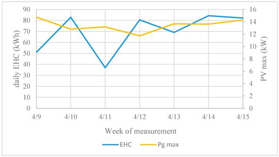 Based on the values from Table 3, the daily EHC profile and the maximum PV generation can be drawn, which is shown in Figure 14.