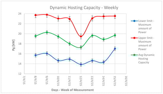 As mentioned before, it is important to mention that these results weren’t exclusively for one day of measurement, since they were also calculated for other days during the week of measurement as shown in Figure 10. The most remarkable result which emerges from the set of data is that the weekly DHC(t) profile is drawn for the system using the values of Table 2. Interestingly, the results are related to the maximum and minimum points in the final curve, as shown from Figure 4 till Figure 7 and from Figure 11 till Figure 13, where the maximum hosting capacity found remained at 23.8 kW and the minimum hosting capacity was 19 kW, describing a 4.8 kW gap between these two values. The DHC(t) profile, as well as the lower and upper limits of the maximum amount of generated power, are shown in Figure 15.