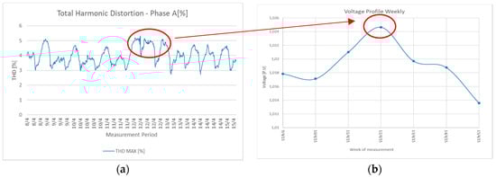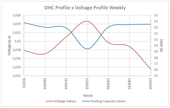 Firstly, in Figure 16a, the THD profile of the system is shown. Additionally, it is possible to estimate that the highest value of the measured THD regarding the week of measurement is related to the high incidence of the 5th harmonic, which is a consequence of the inverters connected to the system. Nevertheless, this value has been found to be typical of PV systems. It is worth observing in Figure 9 that the day 12th of April had the highest THD distortion regarding the measured week. The most striking result to emerge from the data, shown in Figure 16b, is that the highest voltage value was on the 12th of April as well. Thus, the correlation between the THD and the voltage rise is worth mentioning. Consequently, Equation (5) captures the exact response of the voltage rises due to the harmonic distortion. Therefore, there is a satisfactory agreement between the THD and the voltage profile as well as the hosting capacity value. These results are only significant at a DHC(t) profile level.
