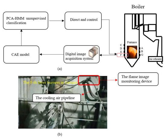 (a) The schematic diagram of the proposed convolutional auto-encoder (CAE) and principal component analysis and hidden Markov model (PCA-HMM) framework for combustion classification and the position of seven layer burners in the boilers with the C, D, E, and F layers of burners on the front wall and the A, B, and G layers on the back wall; (b) The site installation of the flame image monitoring device.