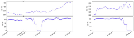 The related variables in the boiler operation process: (a) The actual total load in the training data; (b) the actual total load in the testing data; (c) the coal rate of the F mill in the training data; (d) the coal rate of the F mill in testing data.