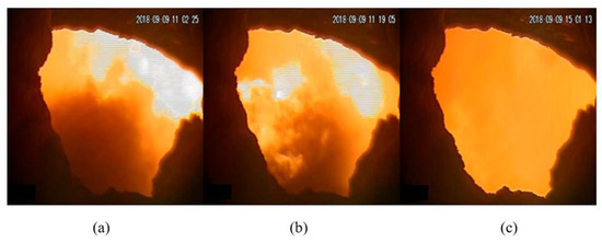 To evaluate the performance of the proposed framework, a coal combustion adjustment experiment was conducted in a opposed-firing boiler. The lines in Figure 3a,b are the actual total load in the training samples and the testing samples during the period of 11:00–17:00. The lines in Figure 3c,d are the coal rate of the F mill. The coal rate was adjusted to make the combustion state of the F layer burners gradually change between stable and unstable. According to the combustion theory [32], the concentration of the pulverized coal is the most important factor directly influencing the pulverized coal ignition and combustion in the airflow. For example, if the concentration of the pulverized coal is low and the amount of heat released is small, then a continuous flame cannot be formed. The large external heat dissipation makes the temperature level decrease, leading to unstable combustion. In the coal combustion adjustment experiment, as shown in Figure 3c, the coal rate was relatively steady at during 11:00–12:00, which means the combustion state was stable; then the coal rate of the F mill began to decrease around 14:35, until it was at 14:45; finally, the coal rate began to increase at 15:02 until the combustion stable state was reached. The combustion was under poor stability when the coal rate was around . We sampled the sequential 14,400 flame images as training sets and the 3600 images for testing sets. In particular, due to the lack of unstable and semi-stable samples, we selected the flame images between the period of 14:00–15:00, both as training and testing data. To differentiate testing data from the training data, we took the average images of 2 s during 13:00–15:00 as the testing data. The selected time periods are shown in Table 1. Figure 4 shows three typical images representing different combustion statuses, in which the combustion status of the flame from left to right are stable, semi-stable, and unstable, respectively.