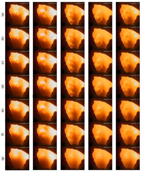 In this section, we explore the compression limit of the latent representation z to ensure that it has small dimensions but still contains enough useful information to reconstruct the original images closely. According to the CAE’s architecture, we tested six different dimensions in the calculation. Figure 6 shows the comparison between the original images and the model’s outputs. When the dimensions of the latent variables are 4096, 2048, and 1024, as shown in Figure 6b–d, the decoded images are diversified, similar to the original images, as shown in Figure 6a, and there is little difference among the three rows of flame images. The decoded images of the CAEs with latent dimensions as 512 and 256, respectively, as shown in Figure 6e,f are blurred and hardly satisfactory in some parts of the images. When the latent dimension is set to , the latent representation contains too little information to reconstruct the input, and there is almost no difference among the right three decoded images in Figure 6g.