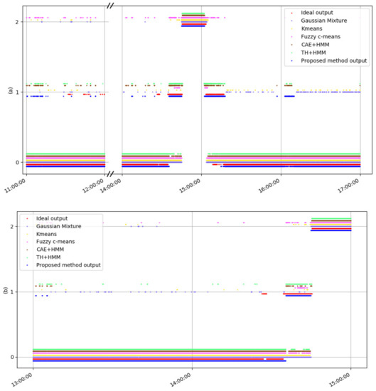 Figure 8a shows the comparison of different methods on the training data. Each point represents the combustion state corresponding to the flame image per second. Combining with the specific ranges of the coal rate (Table 4), the red dots represent the actual states: Category 0, 1, and 2, which represent unstable, semi-stable, and stable, respectively. From the distribution of the red dots, we can see that the unstable state remains at 14:45–15:02 when the coal rate was around 0 t/h; the semi-stable state remains at 14:35–14:45 and 15:02–15:09 when the coal rate was increasing or decreasing between 27 t/h and 53 t/h during those periods. As shown in Figure 8a, these methods, except the fuzzy c-means method (the pink dots), have higher accuracy in recognizing the unstable states; the Gaussian mixture model (the violet dots) and k-means algorithm (the yellow dots) have poor performance in identifying the semi-stable state. The methods that obtain HMMs, such as CAE + HMM (the brown dots), TH + HMM (the green dots), and CAE + PCA − HMM (the blue dots), have relatively steady performance in recognizing the combustion states. In particular, the proposed framework has the most ideal output. The results show that the HMM has an advantage in processing time series, in which the HMM can capture the temporal behaviors in the characteristic parameters and detect the change of combustion status more accurately. The conventional k-means is especially not suitable for this classification task, since the data has temporal behavior. The classification accuracy could be enhanced using the semi-supervised learning algorithms, such as discriminative k-means method [38], which needs further research.