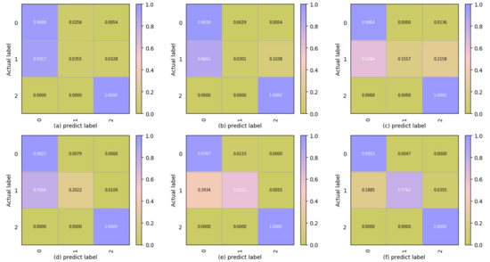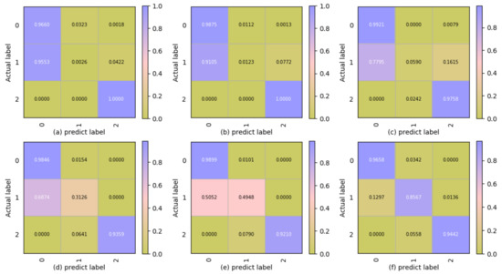 The confusion matrices of different methods on the testing data: (a) CAE + GMM; (b) CAE + k-means; (c) CAE + fuzzy−c-means; (d) CAE + HMM; (e) TH + HMM; (f) CAE + PCA + HMM.
