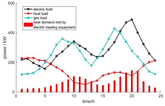 where , , are the equivalent electric, heat, gas load at time t, respectively; , are the P2G power, EB power at time t respectively; , are the P2G efficiency, EB efficiency respectively; , , are the equivalent load matrix, load matrix, P2G and EB power matrix.
