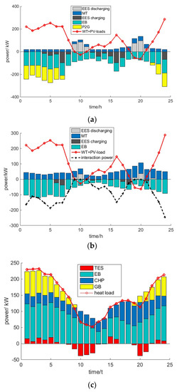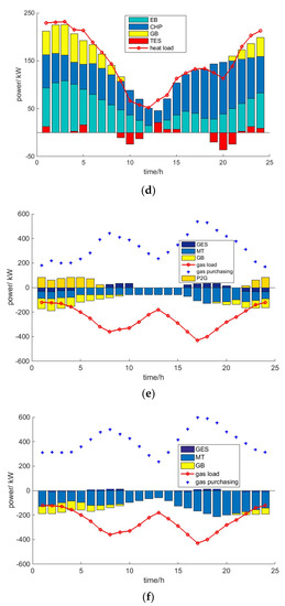The time of use (TOU) power price [16] and nature gas price [10] are shown in Figure 2a. The wind and photovoltaic forecasted power [27] are shown in Figure 2b, and the wind turbine has anti-peak characteristics. As shown in Figure 1, the heat demand for users was met by the supply side and the load side (electric heating equipment). The total air conditioning heat pump power for users was 100 kW and the total water heater power was 50 kW. The load forecasting curve [27] is shown in Figure 3. It can be seen from Figure 3 that the peak of the aggregated demand (after-diversity maximum demand) was much lower than the sum of individual load peaks.