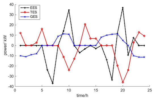 where , , are the power of EES, TES and GES at time t, respectively; , , is the storage matrix, charging matrix and discharging matrix, respectively.