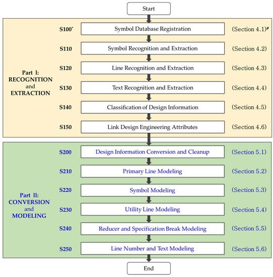Since the 1980s, when the use of personal computers became widespread in the engineering design process, researchers have investigated many approaches to convert drawings to computer-aided digitalized documents. Brown et al. [] and Joseph [] studied logical symbol and numerical character recognition systems that used optical character recognition (OCR) techniques and automated guided searching methods to convert line drawings to the CAD system format.