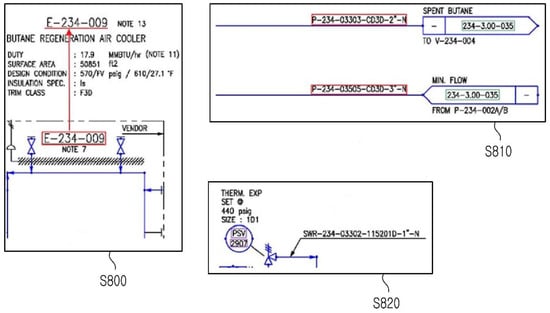 Figure 5 presents an example to explain the step of linking the extracted symbol and text. “800” is the symbol of the equipment, and “E-234-009” in the description field is the equipment name. “810” represents that the line number is associated with “P-234-03303-CD3D-2”-N” and “P-234-03305-CD3D-3”-N” closest to the recognized line. “820” is a symbol of the pressure safety valve that describes the “PSV 2907” linked to the instrument type and serial number.
