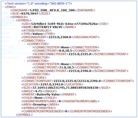 The design information recognized in the image is converted into the symbol, line, and text. All the perceived information has been converted into elements of SP P&ID. The connection of the recognized symbol and property is confirmed in the SP P&ID (Figure 14).