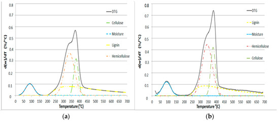 In Figure 2, the individual thermal decomposition of moisture, hemicellulose, cellulose, and lignin is observed in the ranges 25–120, 200–400, 340–400, and 200–600 °C, respectively. Due to its chemical structure, lignin was the most resistant pseudo-component to thermal degradation.