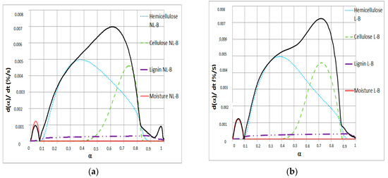 This first series of isoconversional data analyses were completed by representing the deconvoluted data by the relationship dα/dt vs. α in order to identify α values for which the reaction could be produced by the thermal pyrolysis of only one pseudo-component. Results are presented in Figure 4 for both NL-B and L-B.