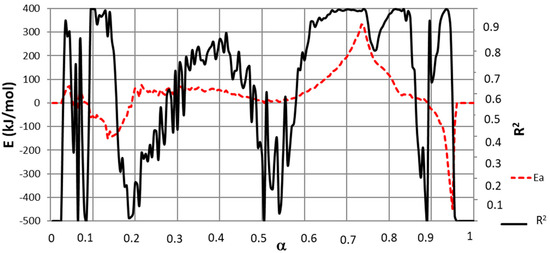 The correlation coefficient (R2) from fitting Equation (12) (and, consequently, Equation (13)) is also presented in Figure 6. This parameter shows the goodness of the fit. It can be concluded from Figure 6 that high R2 values are obtained in zones in which a single pseudo-component was decomposing. In addition, the range of α values in which a high R2 coefficient is obtained coincides with those determined in Figure 4.