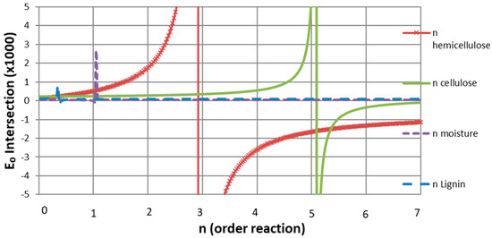 As a result, common first-, third-, and fifth-order reactions were approximated for moisture, hemicellulose, and cellulose, while an n non-integer common order reaction of 0.35 was obtained for lignin. Although these results differ from some published reaction orders for cellulose [12,27], they are consistent with those of hemicellulose and lignin. As the two cited works disagree on cellulose’s reaction order, and since the present work shows a good fit and simulation of the TG curves, the cellulose kinetic parameters are accepted.