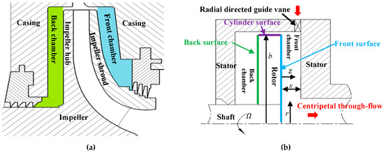 Meridional sketch: (a) a centrifugal compressor stage and (b) the simplified rotor-stator cavity model for a side chamber. : axial coordinate; : radial coordinate; : axial gap width of the front chamber.