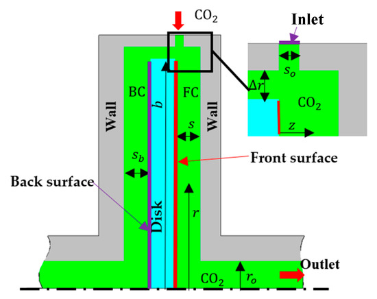 The main application fields of centrifugal carbon dioxide compressors are at oil exploitation sites as the supplies of injection gas or at carbon capture and storage power plants for carbon dioxide compression [1]. To transport more fluid and to lower the energy consumption, the rotational speed of the impeller in a large centrifugal carbon dioxide compressor increases rapidly, whose circumferential Reynolds number , defined in Equation (1), is up to . There are two main methods used to improve the compressor efficiencies. The first method, which is extensively studied, is to optimize the geometry of the impeller. The other method is to conduct the geometry optimization of the side chambers (both the front chamber and the back chamber in Figure 1), which is not sufficiently researched. The unreasonable geometry of the side chamber may result in excessive axial thrust, severe mechanical vibration, large disk frictional loss, low service life, etc. Compared with air, carbon dioxide is a kind of fluid with low kinematic viscosity. The design of the side chambers in such a centrifugal compressor is therefore becoming one of the focuses of study. In Figure 1a, a meridional sketch of a centrifugal carbon dioxide compressor stage is depicted. The side chambers include the front chamber (marked blue) and the back chamber (marked green). The simplified model of either side chamber is the rotor-stator cavity with centripetal through-flow, shown in Figure 1b. In order to design the geometry rationally, it is of great significance to investigate the characteristics of the flow and the heat transfer within the cavity.