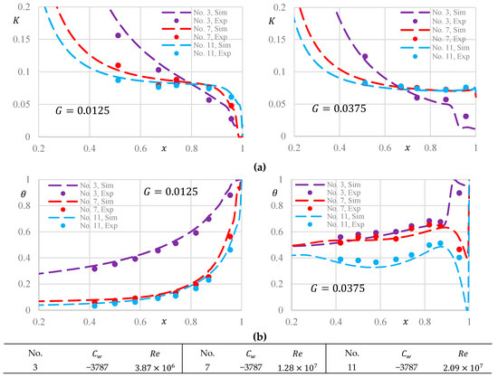 Verification of the numerical simulation set-ups: (a) distribution of and (b) distribution of Sim: from numerical simulations; Exp: by measurements.