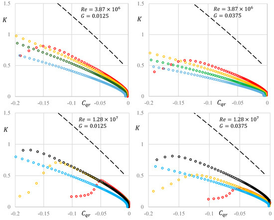 Variations of versus for various and from numerical simulations. Color of hollow points: red: ; orange: ; black: ; blue: ; dashed lines: results from Equation (11).