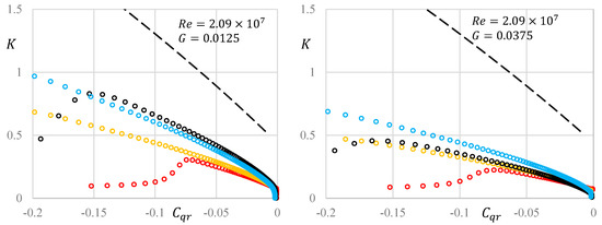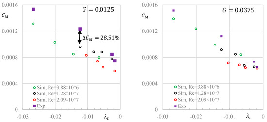 The values of from numerical simulations and the experimental results are plotted in Figure 7. The amounts of keep a decreasing trend with increasing although there is some volatility. Currently, the maximum difference between the simulation results and the experimental data is 28.51%. Two reasons appear to account for the large errors. Each value of on the front surface (see Figure 1) is obtained by reducing the torque on the back surface and on the cylinder surface (related by Equation (14) [11]). It is noted that the torques on the back surface are obtained when there is no through-flow and the axial gap widths of the two side chambers are equal at three speeds of rotation. The maximum error of 28.51% includes at least the errors on both the front and the back surfaces. The second reason is that the friction in the bearing may increase due to the vibration of the disk and the shaft for a smaller axial gap width of G = 0.0125.