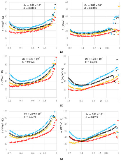 According to the results from numerical simulations, the radial distributions of are plotted in Figure 8. With the decrease of , the amounts of increase in general at each radial coordinate. For wider axial gap widths, the curves are flatter and the values of are smaller. Near the centripetal inlet (), the parameter h is irregularly distributed versus . The values of are volatile for . The explanation for this phenomenon is that there is a jet flow near the centripetal inlet. The flow begins to separate when pumped into the front chamber, which significantly impacts the local heat transfer capacity. The values of drop as decreases from 0.85 to 0.4. It is believed that when the flow enters the cavity, it is accelerated by the disk resulting in the increase of . The increment of becomes smaller when decreases from 0.85 to 0.4, resulting in the flatter curves (see Equation (6)). At the low radius region, when the amounts of exceed 1, the flow rotates faster than the disk and is decelerated. The values of then drop with decreasing . This appears to result in the increase of with decreasing () in most of the results from numerical simulations.