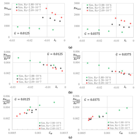 The parameter mainly determined the flow pattern inside the cavity, and then the general heat transfer capacities [6]. The values of Nuave, computed with Equation (7), are plotted versus in Figure 9a. During the calculation, the parameter (from Equation (8)) is considered as a fixed value every 1 mm along the radius. The amounts of increase with the increase of while they drop with increasing . For smaller axial gap widths, the values of are larger. When is not large enough, the parameter is mainly affected by λt in a rotor-stator system [6,31]. In [31], the values of range from 0 to 1.6. In this study, however, the values of do not exceed 0.03. The parameter is therefore analyzed according to . It is noted that the exponent value of 0.8 is typical for turbulent boundary layers, as put forward by Schlichting [37]. Aus der Wiesche [38] pointed out that small deviations exist with regard to the exact value of that value in the literature. However, it should be remarked that these deviations are typically of minor importance in comparison with the experimental uncertainty levels occurring in actual systems. As shown in Figure 9b, the values of are almost in linear relationships with for the three values of and two values of . The parameter has quite small impacts on at a fixed λt value. The finding is in accordance with the conclusion by Owen and Rogers [6]. Similar trends can also be found in a rotor-stator cavity with centrifugal through-flow [31]. In Figure 9c, the variations of are plotted versus . With the increase of , the values of increase in general at a fixed value. The results are considered reasonable because the values of can be indirectly estimated with the values of [6].