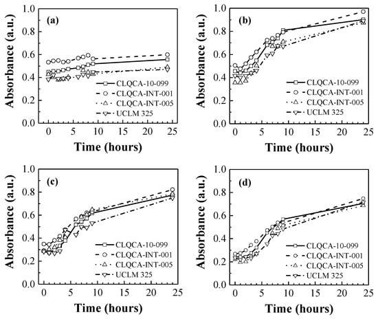 Growth curves of the different S. cerevisiae strains (CLQCA-INT-001, CLQCA-INT-005, CLQCA-10-099 and UCLM 325) at different nitrogen concentrations (yeast hydrolysate): (a) without nitrogen source, (b) 0.2 g N·L−1, (c) 0.3 g N·L−1, and (d) 0.4 g N·L−1. Plotted values correspond to average values across three replicates. Standard deviations were <5.4% in all cases, and generally <3% (error bars are not shown because of the small standard deviation values).