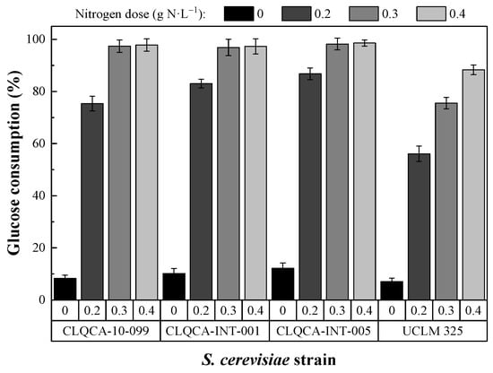 Glucose consumed by the four S. cerevisiae strains under study (CLQCA-10-099, CLQCA-INT-001, CLQCA-INT-005 and UCLM 325) after 24 h of fermentation for different nitrogen supplement doses: 0.2 g N·L−1, 0.3 g N·L−1 and 0.4 g N·L−1 from yeast hydrolysate; and without nitrogen source. Error bars represent the standard deviation across three replicates.
