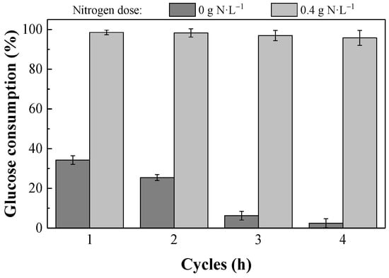 Conversely, culture medium supplementation with a nitrogen source (Figure 1b–d) led to an exponential growth of the yeast population. Glucose consumption increased in response to increasing nitrogen concentrations in the fermentation medium, being more efficient at 0.3 and 0.4 g N·L−1.
