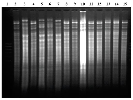 Restriction analyses of mitochondrial DNA of S. cerevisiae for CLQCA-10-099 (2), CLQCA-INT-001 (3), CLQCA-INT-005 (4) and UCLM 325 (5) strains. 1 kb DNA ladder (1). Strains present in the last fermentation cycle (6–15).