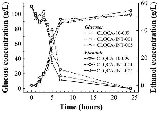 The CLQCA-10-099, CLQCA-INT-001, CLQCA-INT-005 and UCLM325 strains showed positive assimilation and fermentation after 24 h. In addition, they showed ethanol yields higher than 90% with respect to the theoretical ethanol yields (0.51 g ethanol·g glucose−1), which made them the most promising candidates to be assayed in the rest of the study.