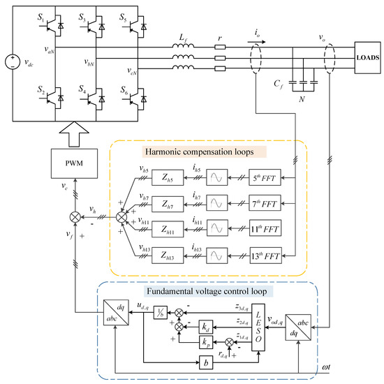 Figure 1 shows the diagram of proposed control, it consists of a fundamental voltage control loop and some specific frequency harmonic compensation loops. The fundamental voltage control loop adopts the LADRC controller in the synchronous reference frame, and its output signal is . Harmonic compensation loops works by shaping harmonic voltage drops with harmonic currents and virtual harmonic impedances. The total output signal of controller is given as follows: