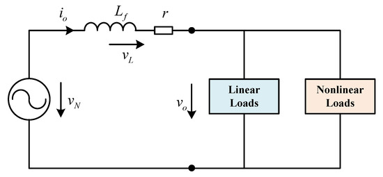 The effect of filter capacitor can be disregarded in low frequency systems, hence the main response of the LC filter can be represented by an inductance , the simplified circuit is shown in Figure 2. Where is the voltage generated by the inverter and is the voltage drop of filter inductance and parasitic resistance. is the inverter output current, in which low-order harmonic components lead to the distortion of output voltage . When the nonlinear loads are far away from the inverter, this distortion will be more serious due to the combined effect of line impedances and filter inductances.