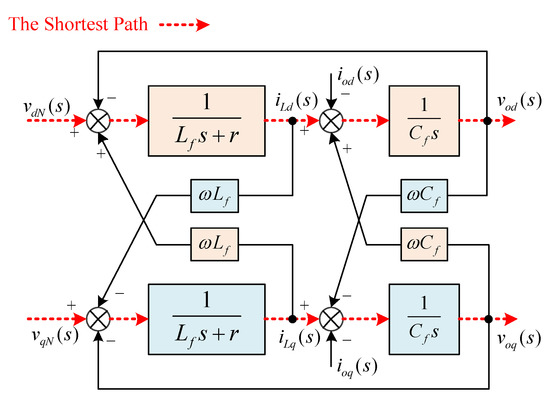 According to the system (3), the diagram of LC type inverter in s domain can be drawn, as shown in Figure 3. On d-axis, the input of this system is , the output is , and the shortest path is shown in the red dotted line. There are two integrators on this path, so the the d-axis system is a two-order model. Similarly, the system on the q-axis is also a two-order model.