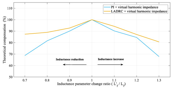 Furthermore, as virtual harmonic impedance effectiveness depends on the real inductance value , in this section a sensitivity analysis regarding to variations of the output LC filter parameters is shown in Figure 9. It can be seen that compared with PI, the use of LADRC makes the output inductance fluctuation have less influence on the harmonic compensation effect. Authors in [21] indicates that the value of parasitic resistance has a weak influence on the virtual harmonic impedance, so the influence of parasitic resistance in this paper is not studied.