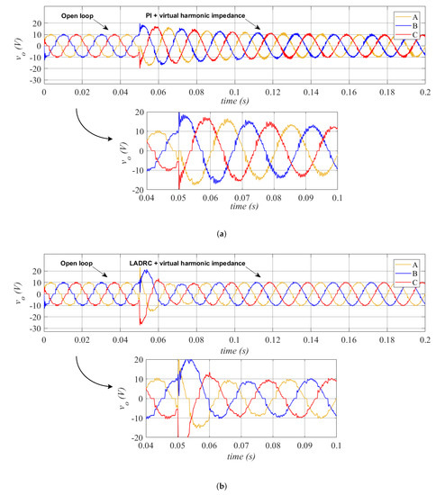 In order to verify the performances of the proposed strategy, simulations and experiments are designed in this section. A LC type three-phase three-leg inverter of Figure 1 is used, and a resistive linear load and a non-linear load are respectively connected to the output terminals. The nonlinear load consists of a three-phase full-bridge rectifier and a series resistive and inductive load. In order to ensure the reasonableness of the comparison, when the virtual harmonic impedance parameters of the design are unchanged, the PI and LADRC algorithms are used in the fundamental voltage control loop respectively.