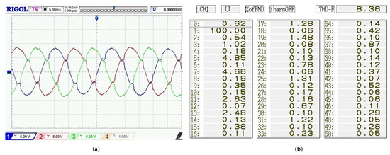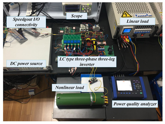 In this paper, an experimental platform is built (shown in Figure 11), which includes an LC type three-phase three-leg inverter, a Speedgoat real-time controller, a Faith DC power source, a three-phase linear Load, a nonlinear load, a Hioki power quality analyzer and a four-channel oscilloscope. The Speedgoat real-time controller consists of a real-time target machine, an input module and an output module. The hardware circuit topology and parameter selection of inverter are the same as those in Section 5.1. The circuit parameters and the controller parameters are shown in Table 1 and Table 5, respectively.