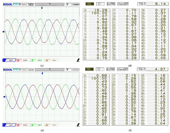 As shown in Figure 12a, there is a significant distortion of the output voltage waveforms under the open loop control. In addition, due to the non-ideality of the three-phase linear load, there is a slight unbalance in the output voltage. Figure 12c shows the output voltage waveforms under the control of the dual-loop PI at the fundamental voltage control loop. As can be seen from this figure, the harmonics in the output voltage are partially compensated, but there are still significant distortions. Moreover, the three-phase unbalance has not improved. Figure 12e shows the output voltage waveforms under the proposed control strategy. It can be seen that the harmonics of the output voltage are significantly compensated. Moreover, the three-phase unbalance problem has also been improved. The reason for this effect is that LADRC can estimate and compensate for disturbances in the system and unmodelled dynamics (i.e., total disturbance f), thereby improving power quality.