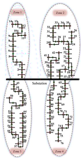The studied grid is a 84-bus IEEE grid the single-line diagram of which is shown in Figure 2. The grid is divided into 4 zones and 4 WTs are in four zones. In other words, a WT is considered for each zone. The 84-bus grid has active and reactive loads of 28,350 and 20,700 kW, respectively. The total loss of this grid is 531.8 kW and the lowest voltage of this grid occurs at bus 10, which is 0.9285. The information on this grid is taken from Reference [17]. In this section, the maximum capacity of each WT is considered 5 megawatts.