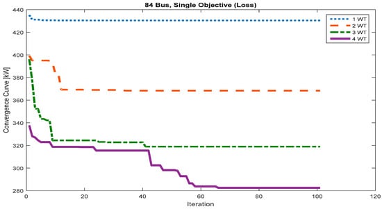 The convergence curve of the PSO method in single-objective optimization is presented in Figure 3. Accordingly, with the increase in the number of WTs, the value of the objective function improves and fewer losses occur. The results of these optimizations are presented in Table 1.