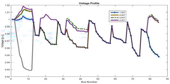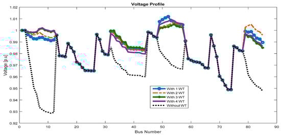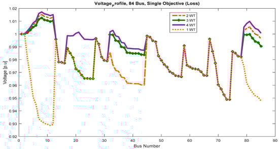 As is known, the increase in the number of turbines has had a great effect on reducing losses and grid voltage. In addition, the grid voltage profile with WTs is shown in Figure 4, which indicates that, with increasing their number, the voltage oscillations decrease, and the grid voltage profile is improved. It should be noted that the results of single-objective optimization, including losses and minimum and maximum voltages, are consistent with the results of Reference [17].