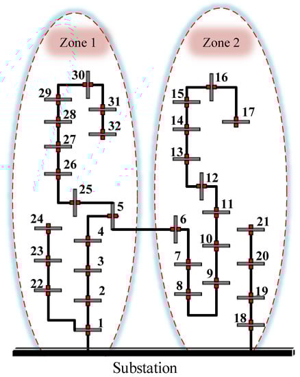 The second grid is a 32-bus grid that its single-line diagram is depicted as two separate zones in Figure 7. The information on this grid is taken from Reference [17]. In this section, the maximum capacity of each WT is considered 2 megawatts. The 32-bus grid in normal conditions has an active loss of 202.67 kW.