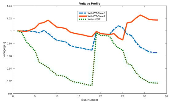 Here, it is attempted to select the suitable site for the installation of four WTs with respect to constraints. For this purpose, as shown in Figure 2, the grid is divided into four zones. Due to the presence of 4 WTs, 15 scenarios have been created that are categorized in four different cases as stated. It is necessary to note that in this section, the problem solution is presented as a multi-objective. The results of the optimization are presented in Table 4. Accordingly, the variable considering all WTs in the fourth case leads to the highest losses reduction and improves grid voltage profiles. The grid voltage profile before and after the installation of WTs is shown in Figure 6. It is clear that the presence of WTs has greatly improved the grid voltage profile.