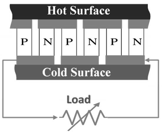 Typically, in a commercial TEG module (shown schematically in Figure 1), ceramic substrates are on either external side of the module, and N-type/P-type semiconductors are placed parallel to each other and connected in series between these ceramic plates. Applying a temperature difference between the TEG sides will generate electrical power in accordance with the Seebeck effect [16].