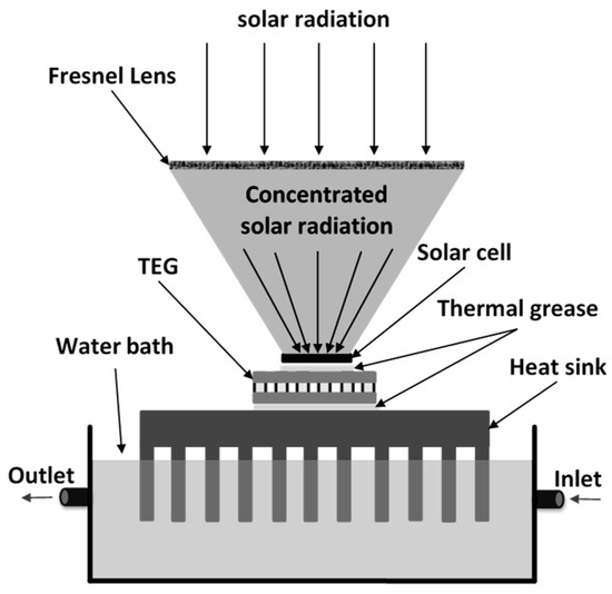 where is the optical efficiency of the Fresnel lens and is assumed to be 85% [19,20]. This received solar radiation power is partially converted into electricity , while the remaining part is dissipated as heat generated inside the PV cell, and is transferred to the top side of TEG.