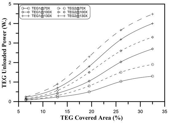Unloaded power generated by the TEGs was increased as a result of increasing the heated area, as shown in Figure 5. The figure shows the unloaded output power of the two TEG modules at three different emulated optical concentration ratios of 70X, 100X, and 130X. A nonlinear increase in the output power of both TEGs was measured with a smaller area covered, while an asymptotic increase of the TEG output power was predicted when the covering area was increased further.